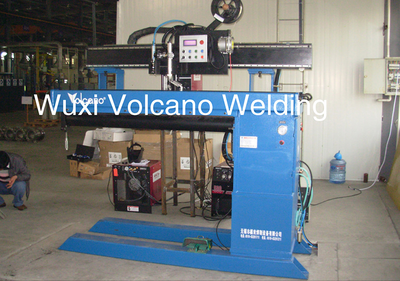 纵缝自动焊接专机主要用于薄板纵缝焊接,采用悬臂式机构,主要由机架、夹紧机构、水冷芯轴、衬垫、轴端托架、行走小车、十字滑架、送丝机构、夹枪装置等组成。其夹紧机构是通过压缩空气使琴键压板上的气囊膨胀,在琴键压板端产生最 大25kg/cm的线压力,左右压指间距可调,以适应不同的焊缝宽度;芯轴按筒体焊缝长度设计成不同直径,以保证一定的刚度。芯轴水冷衬垫紧贴工件,衬垫设有凹槽,槽内均布保护气孔,保证焊缝背面成形和冷却。芯轴垂直高度可调,以适应不同板厚的焊接;机架横梁上部安装行走小车,通过导轨和驱动机构使小车在横梁上作直线运动,速度变频调节。