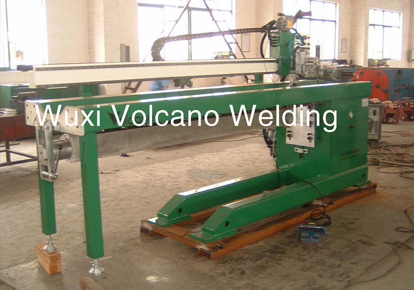 纵缝自动焊接专机主要用于薄板纵缝焊接,采用悬臂式机构,主要由机架、夹紧机构、水冷芯轴、衬垫、轴端托架、行走小车、十字滑架、送丝机构、夹枪装置等组成。其夹紧机构是通过压缩空气使琴键压板上的气囊膨胀,在琴键压板端产生最 大25kg/cm的线压力,左右压指间距可调,以适应不同的焊缝宽度;芯轴按筒体焊缝长度设计成不同直径,以保证一定的刚度。芯轴水冷衬垫紧贴工件,衬垫设有凹槽,槽内均布保护气孔,保证焊缝背面成形和冷却。芯轴垂直高度可调,以适应不同板厚的焊接;机架横梁上部安装行走小车,通过导轨和驱动机构使小车在横梁上作直线运动,速度变频调节。
