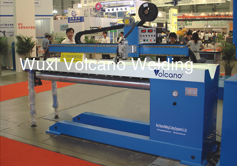纵缝自动焊接专机主要用于薄板纵缝焊接,采用悬臂式机构,主要由机架、夹紧机构、水冷芯轴、衬垫、轴端托架、行走小车、十字滑架、送丝机构、夹枪装置等组成。其夹紧机构是通过压缩空气使琴键压板上的气囊膨胀,在琴键压板端产生最 大25kg/cm的线压力,左右压指间距可调,以适应不同的焊缝宽度;芯轴按筒体焊缝长度设计成不同直径,以保证一定的刚度。芯轴水冷衬垫紧贴工件,衬垫设有凹槽,槽内均布保护气孔,保证焊缝背面成形和冷却。芯轴垂直高度可调,以适应不同板厚的焊接;机架横梁上部安装行走小车,通过导轨和驱动机构使小车在横梁上作直线运动,速度变频调节。